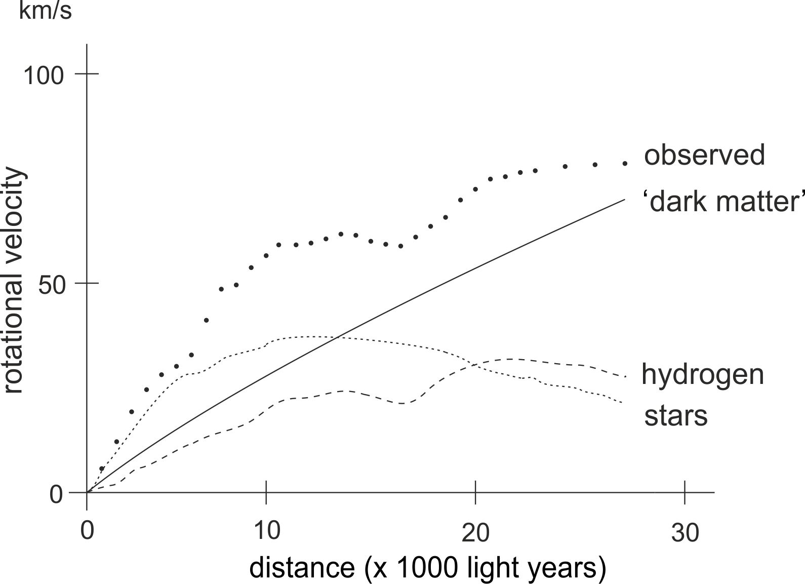 De gegevens hebben betrekking op een relatief klein stelsel, waarbij de buitenste roterende materie – op deze afstand in de vorm van waterstofwolken – zich op een afstand van bijna 30 000 lichtjaar vanaf het centrum bevindt. Op de verticale as staan de rotatiesnelheden aangegeven. De curve ‘observed’ wordt gevormd door de meetpunten van de feitelijk waargenomen rotatiesnelheden. De curven ‘stars’ en ‘hydrogen’ zijn gebaseerd op rotatiesnelheden die zijn berekend op basis van de massa van de waargenomen lichtgevende materie, respectievelijk van de waargenomen waterstof. Het is duidelijk dat de op basis van de in feite aanwezige massa berekende rotatiesnelheden al op een afstand van enige duizenden lichtjaren veel lager zouden moeten zijn dan de op deze afstand (en na deze tijd!) waargenomen rotatiesnelheden. De waargenomen rotatiesnelheid (de curve ‘observed’) vertoont naar de periferie toe zelfs een verdere stijging, wat lijkt te wijzen op een veel grotere massa dan er in feite in dit stelsel aanwezig is.