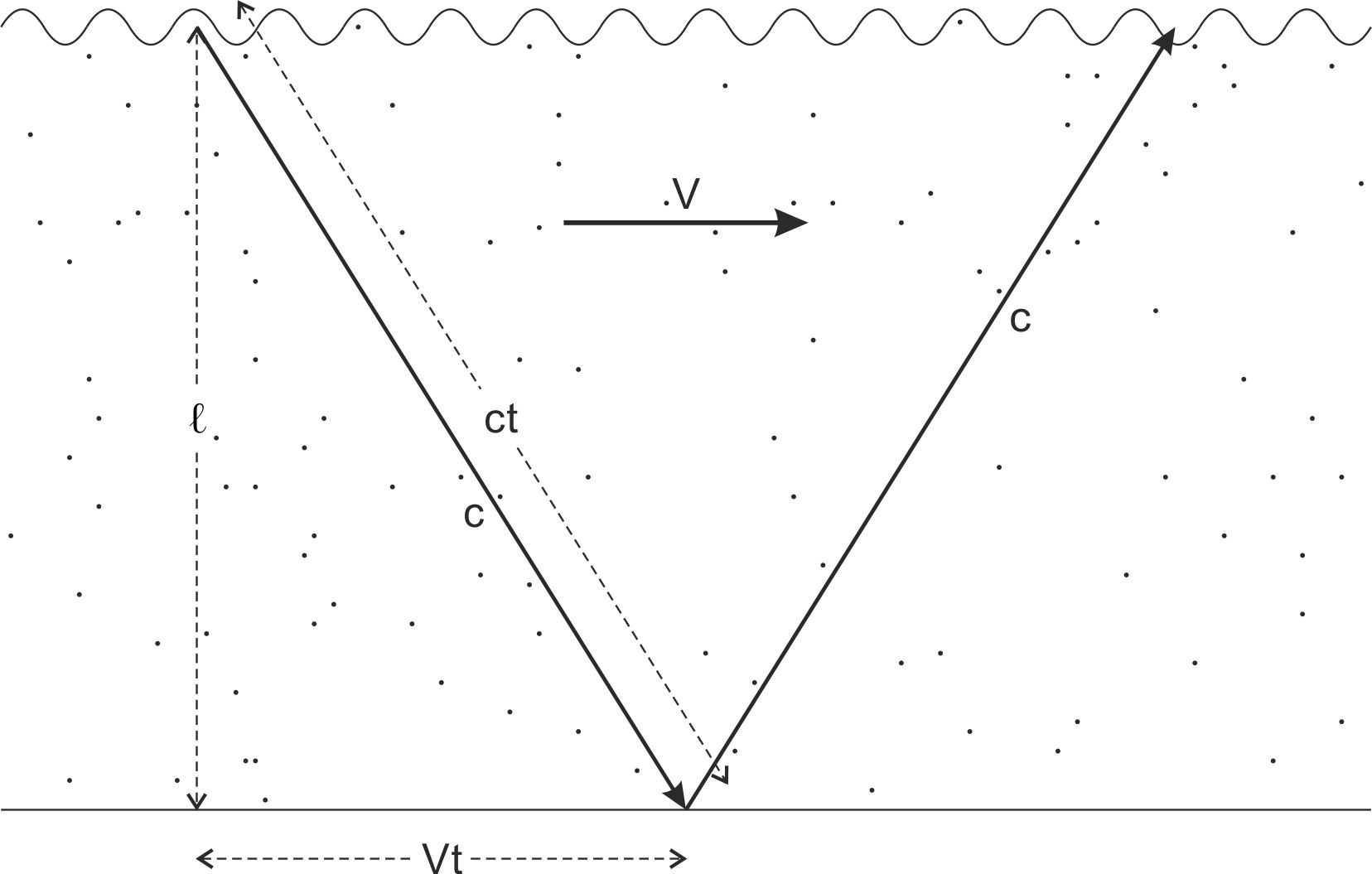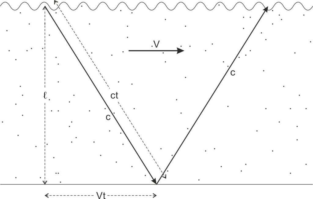 Fig. 1-4. Door de beweging van zijn onderstroom met een snelheid V, wordt het door een atoom bij zijn ‘op- en onderduiken’ in de subta afgelegde traject verlengd van een afstand 2 ℓ tot een afstand 2ct.