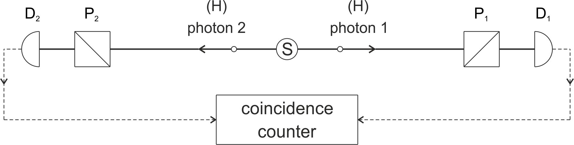 De bron S genereert paren in hoge mate gelijke, beide horizontaal (H) gepolariseerde, afzonderlijke fotonen (aangegeven door cirkeltjes) en zendt steeds één foton in de ene richting en één foton in de andere richting. Voor de detectors D1 en D2 zijn de met verschillende hoekwaarden instelbare polarisators P1 en P2 geplaatst. Het aantal coïncidenties (detectie van een foton door beide detectors binnen een tijd van 20 ns) wordt geteld door de coïncidentie ‘counter’.